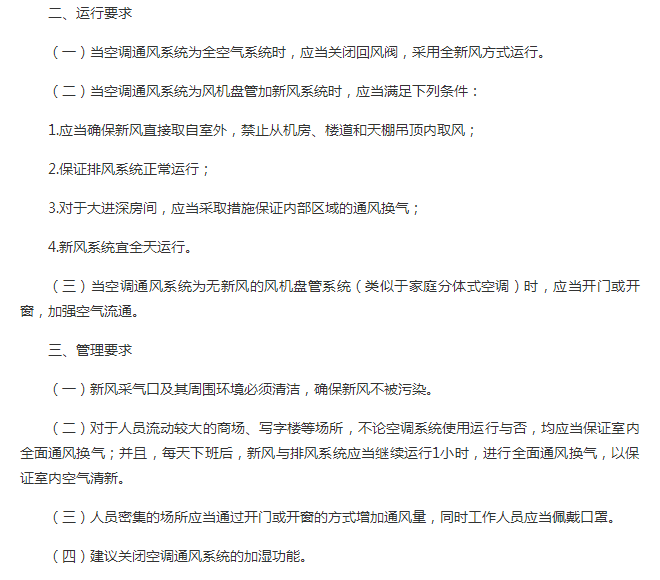 4、对于写字楼等场所,不论空调系统使用运行与否,均应保证室内全面通风换气,并且,每天下班后,新风与排风系统应当继续运行1小时,进行全面通风换气,以保证室内空气清新。